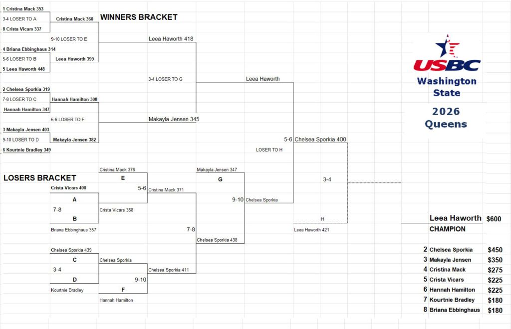 Congratulations to Leea Haworth! Haworth remained undefeated through the winners bracket. After a loss to Chelsea Sporkia (419–392), they bowled an additional two-game final and she came back strong to claim the crown with a 421–400 victory.